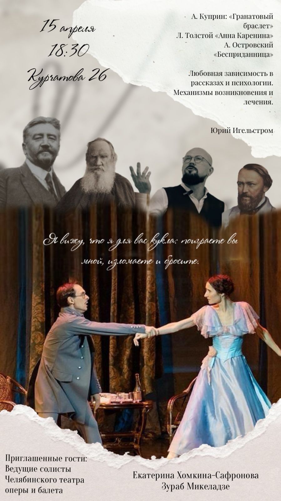 Особое украшение встречи – участие артистов Челябинского театра оперы и балета, исполняющих роли в классических постановках «Анна Каренина» и «Бесприданница» Екатерины Хомкиной - Сафроновой и Зураба Микаладзе, которые поделятся своим видением темы любви и зависимости на основе опыта работы над этими образами.